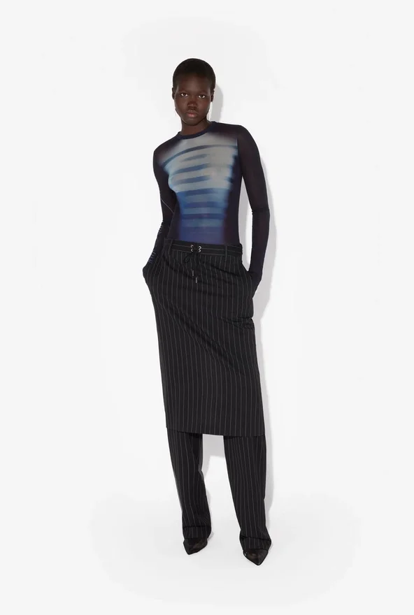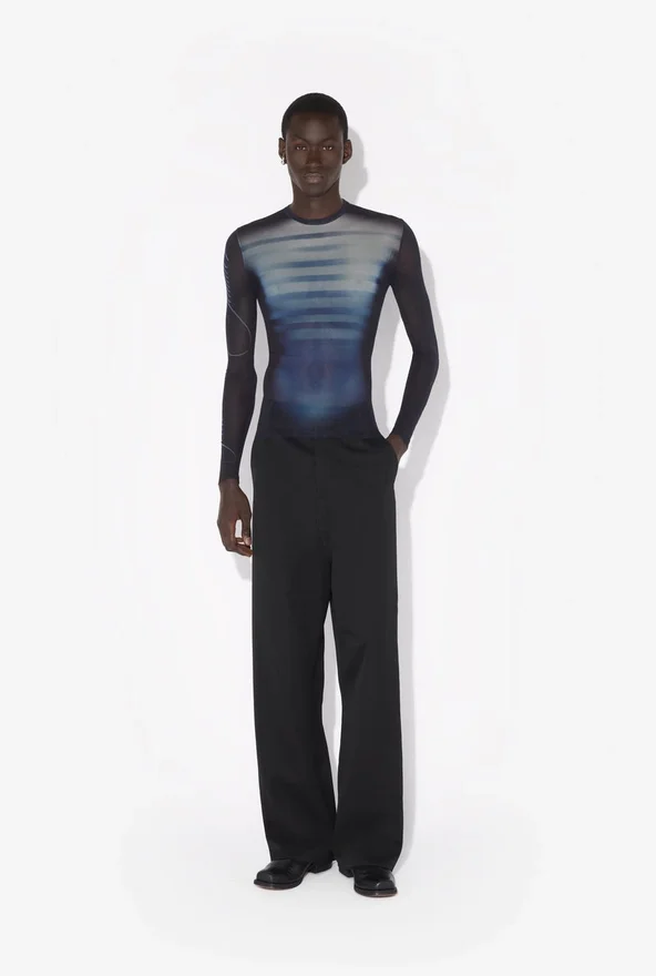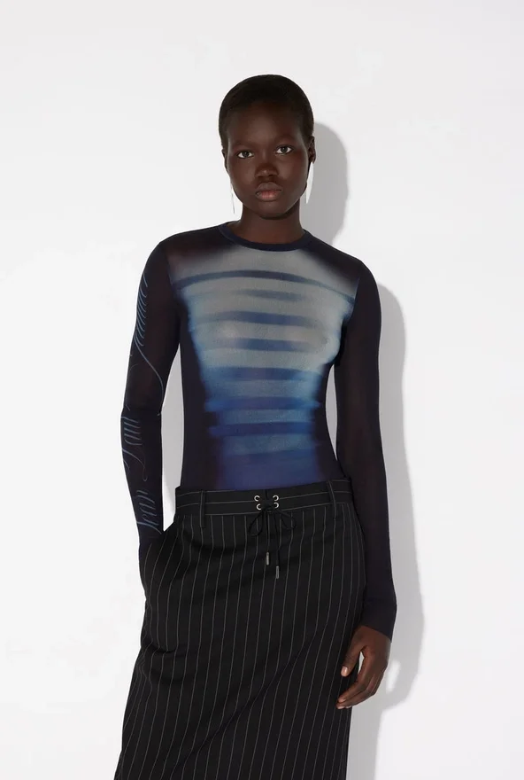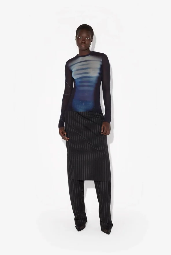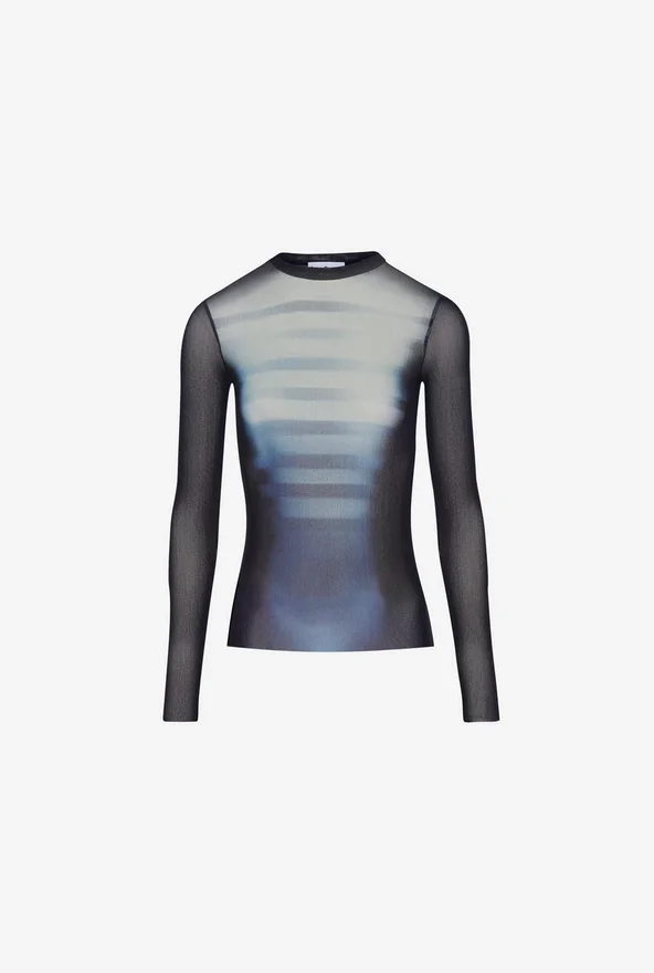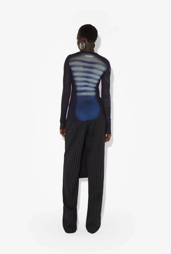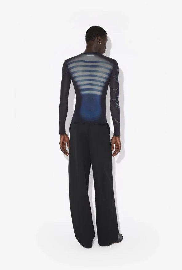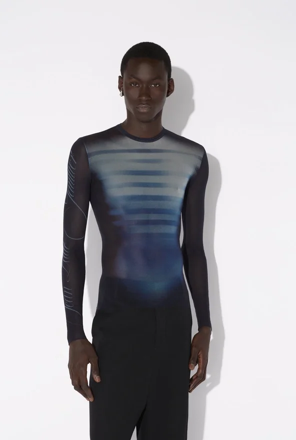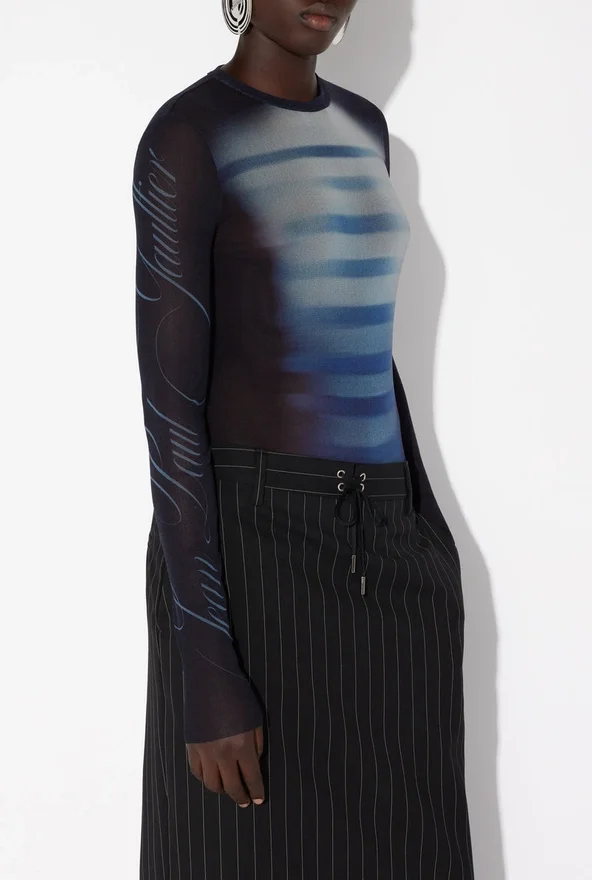 Blå långärmad topp i tyll med ”Le Male”-tryck.